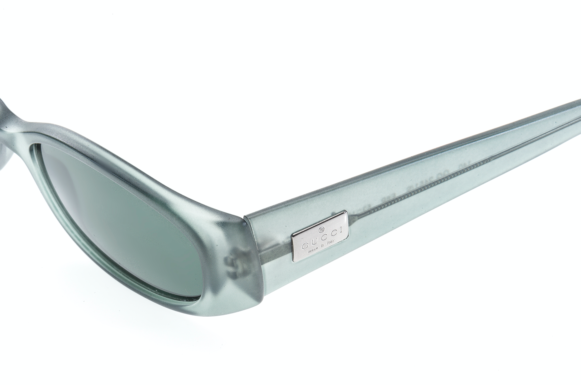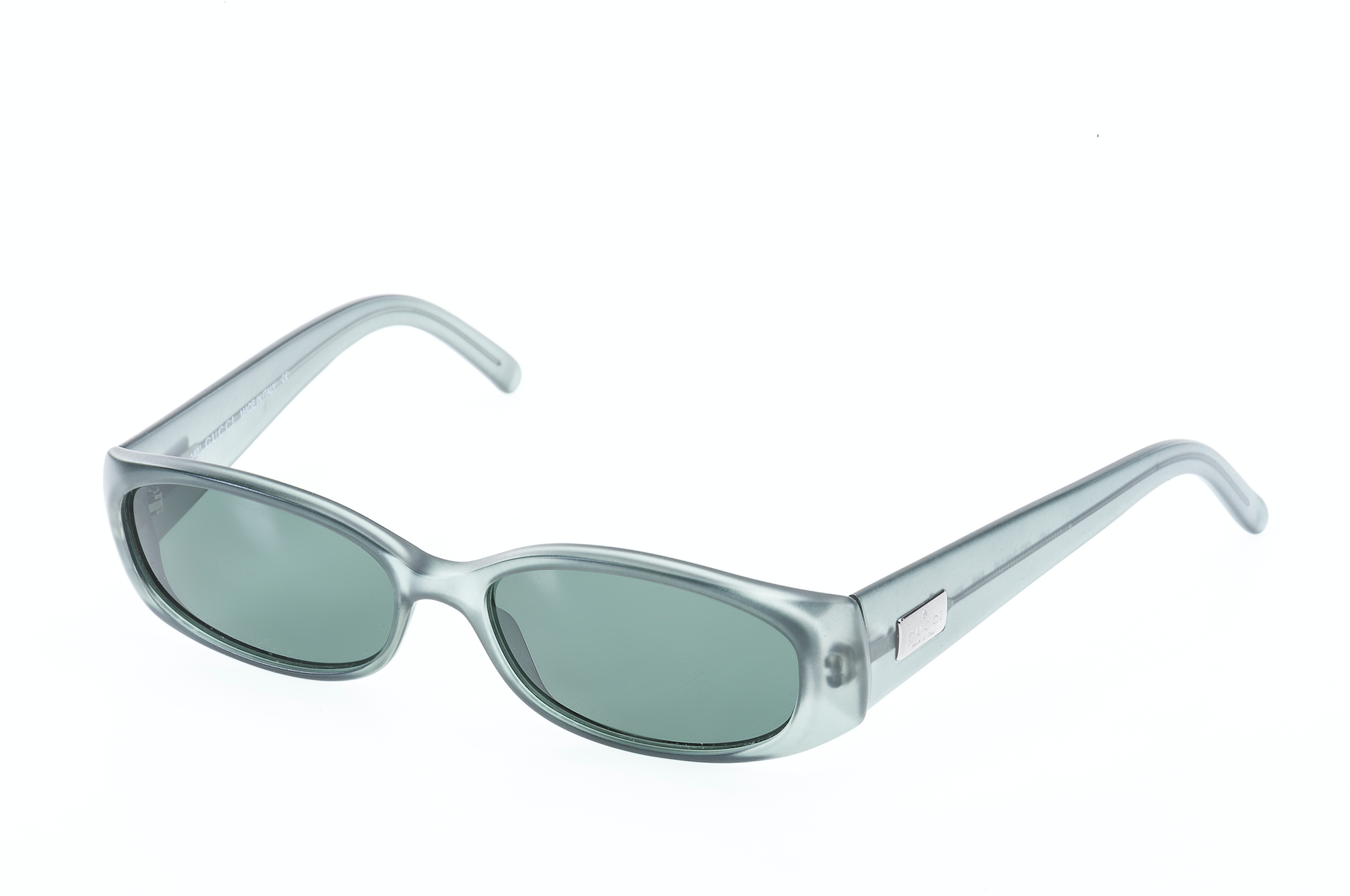 Lentes transparentes con un tono entre verde y gris, hechos en Italia, marca GUCCI.