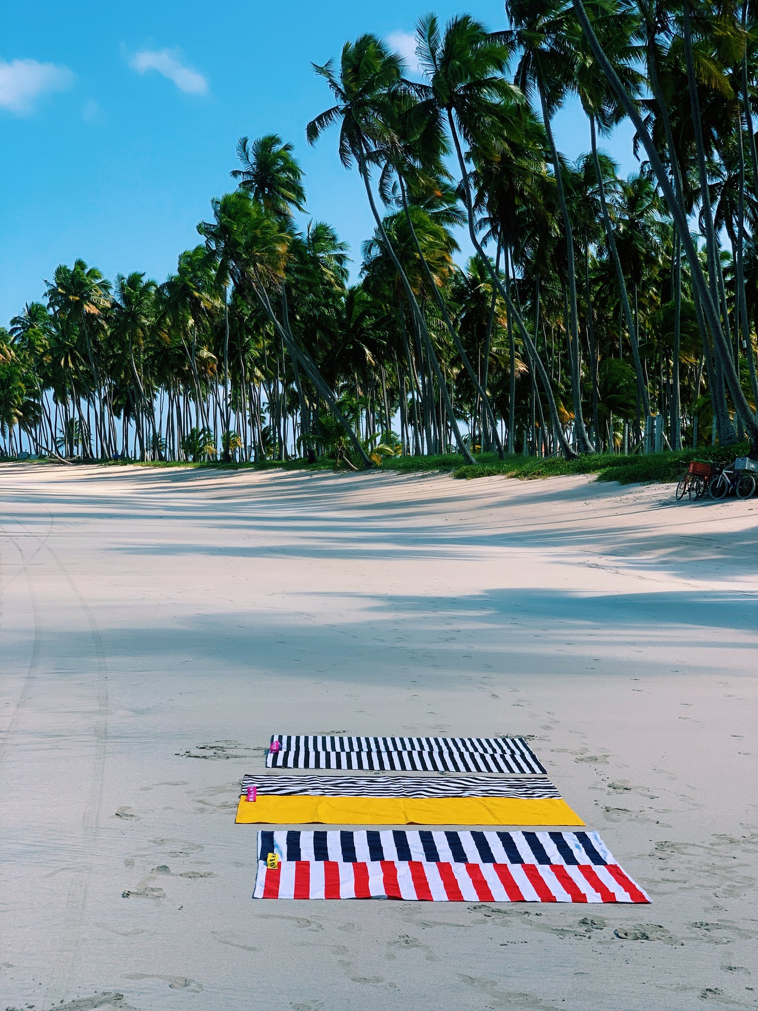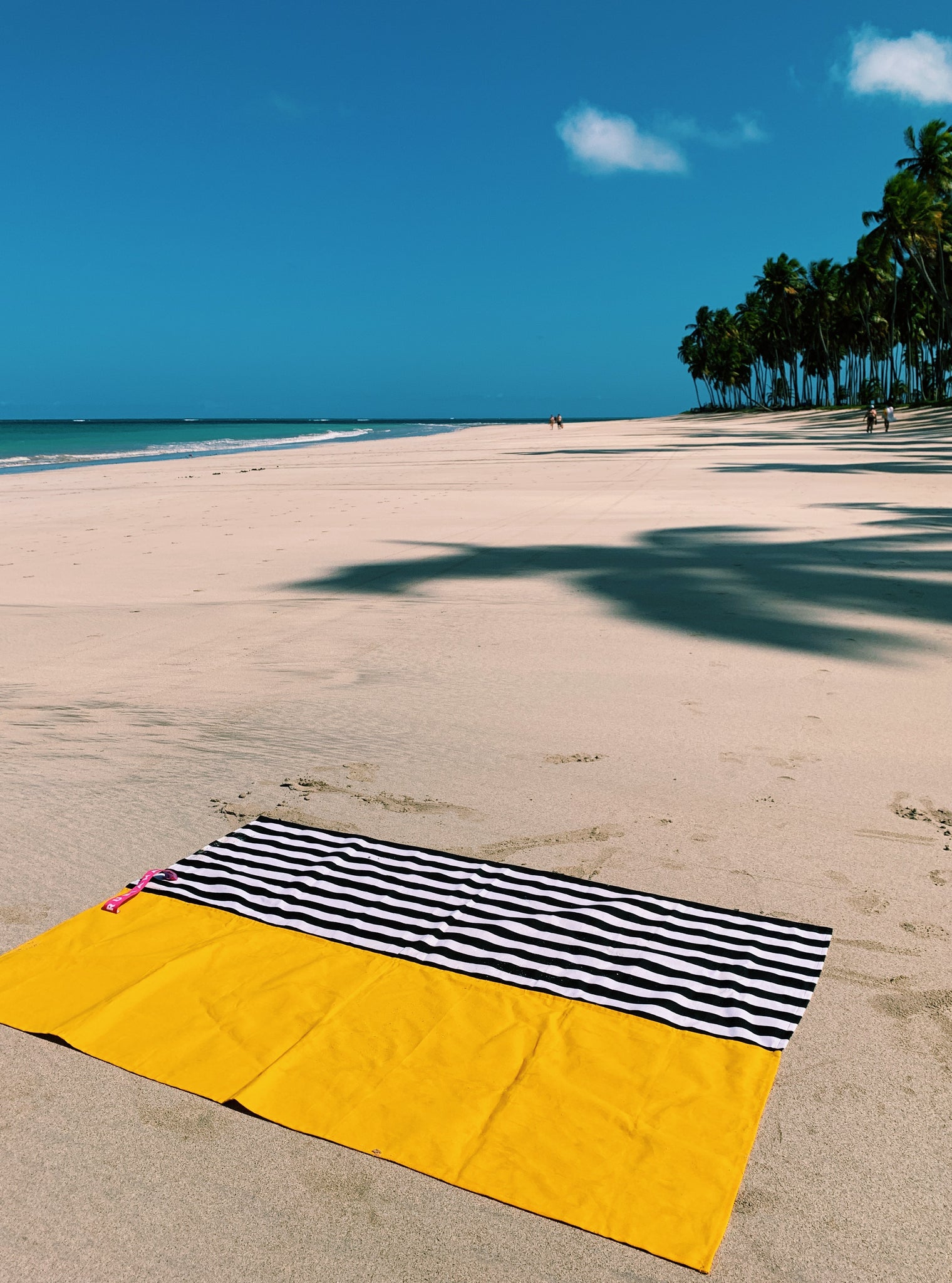 Lona de playa mixta, mitad rayada blanco y negro y mitad amarillo liso.