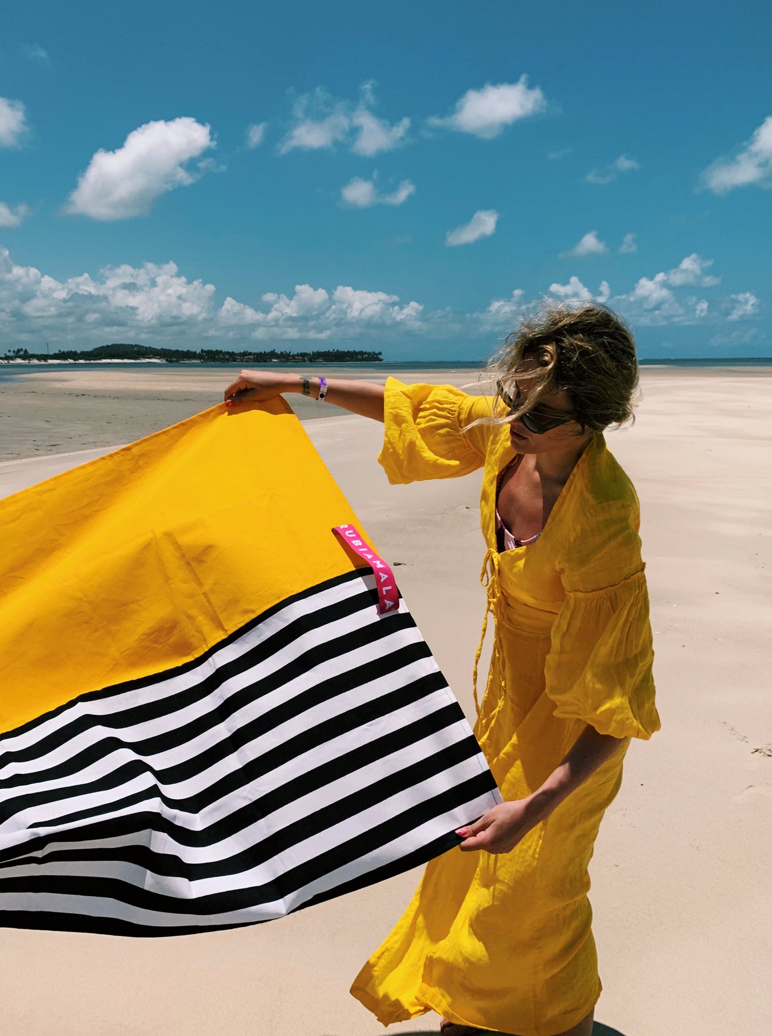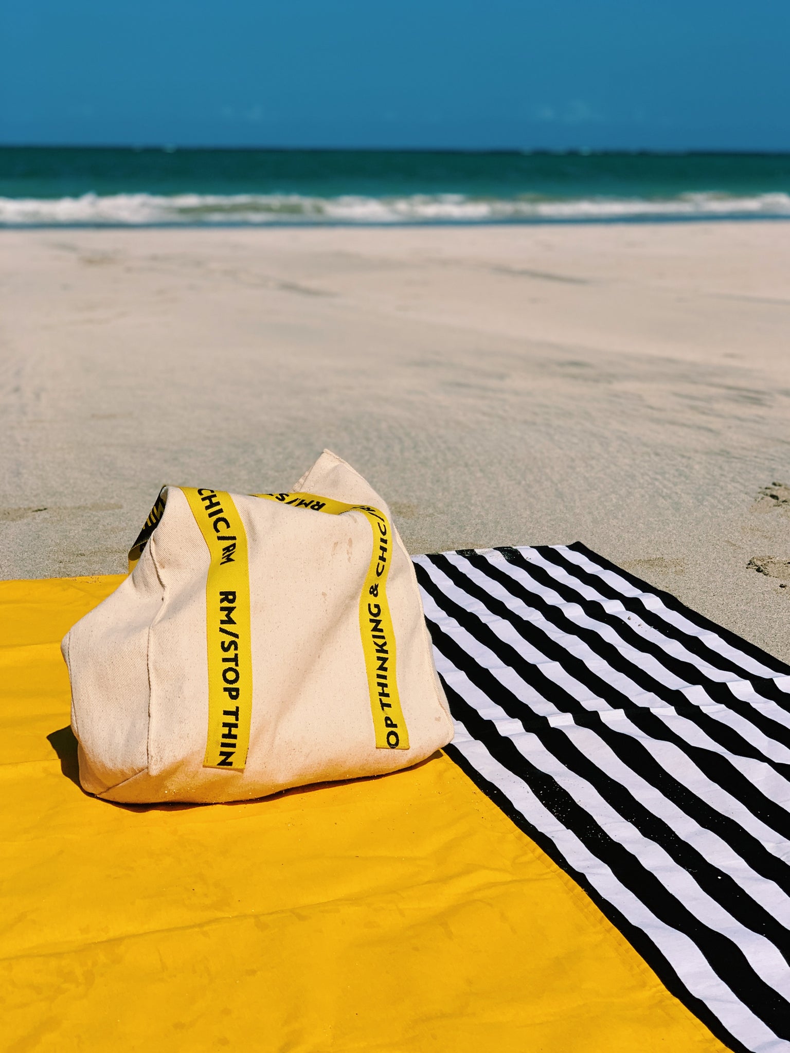 Lona de playa mixta, mitad rayada blanco y negro y mitad amarillo liso.