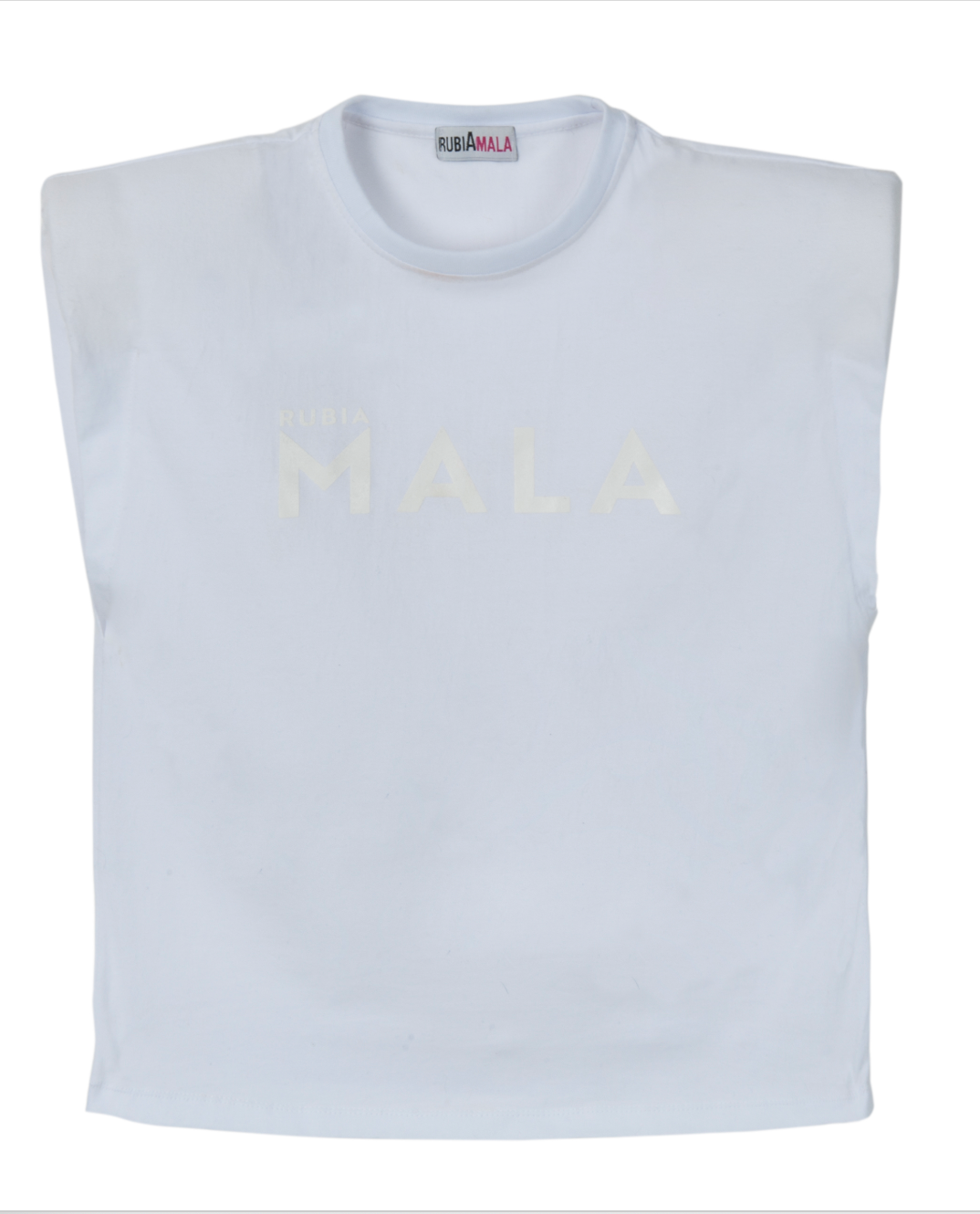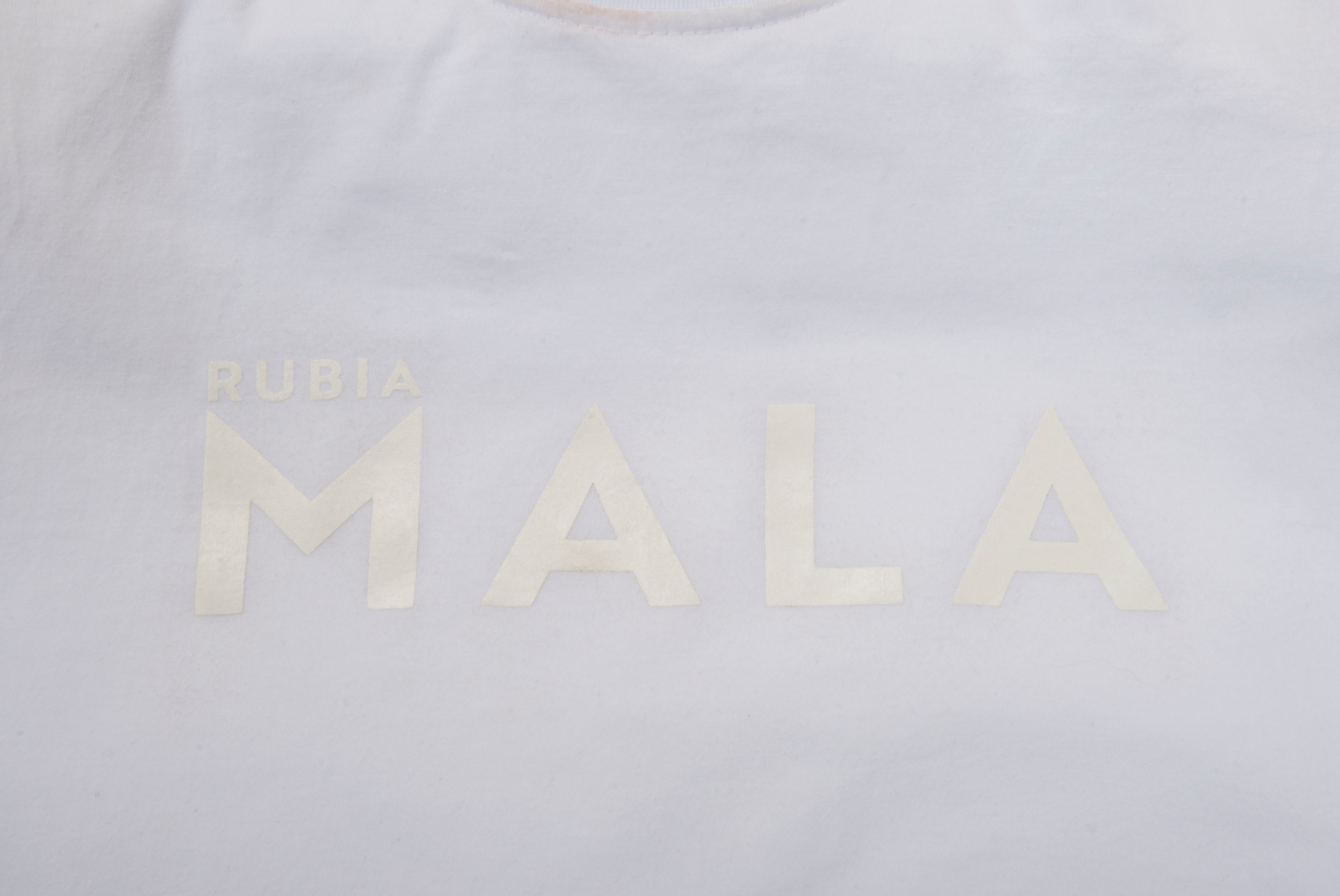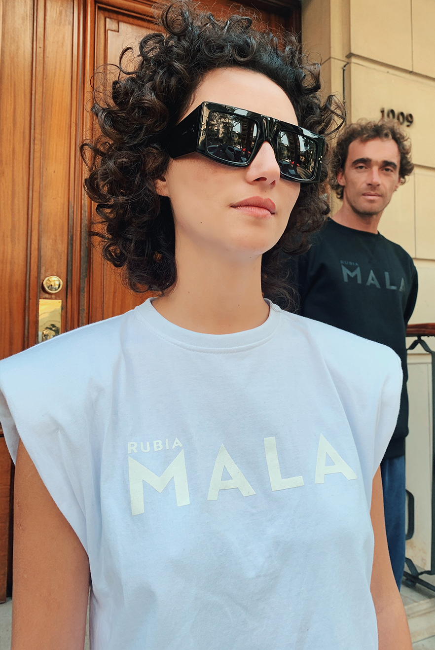 Remera 100% algodón hecha en Uruguay con inscripción "rubia MALA" en el frente.