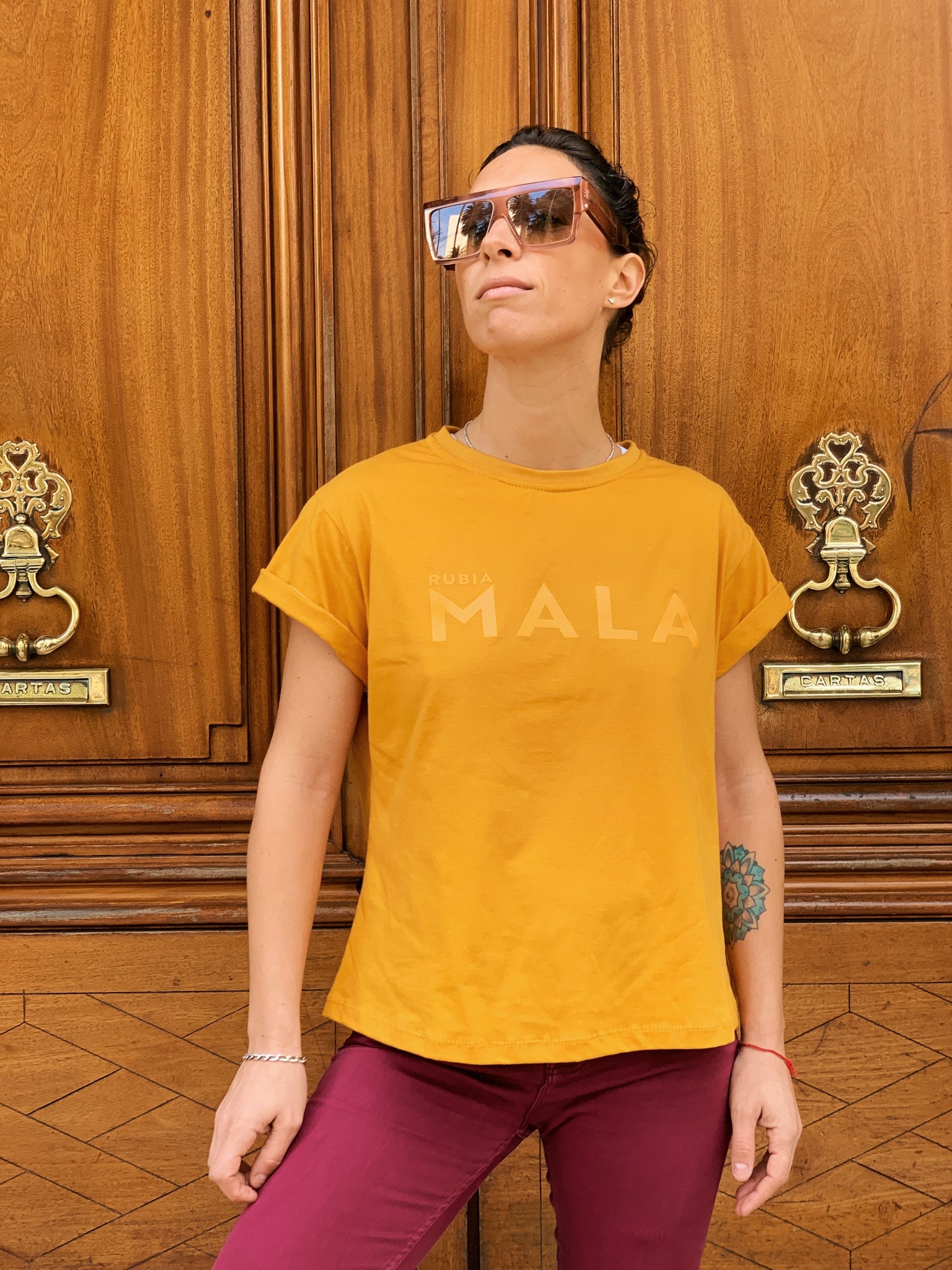 Remera 100% algodón hecha en Uruguay con inscripción "rubia MALA" en el frente.